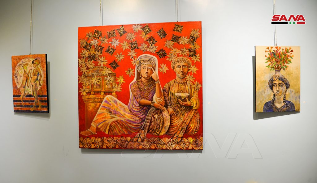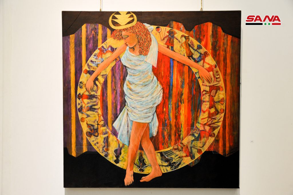 المعرض الذي تستضيفه صالة زوايا يضم 51 عملا بتقنية الزيتي وبأحجام تنوعت بين المتوسط والكبير وبأسلوب تعبيري خلط الرموز الأسطورية التاريخية وبين الشخوص والمشاهدات اليومية من الحاضر مع وجود كبير للمرأة والأطفال.
