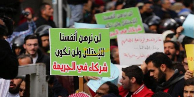 كما رفع المتظاهرون لافتات كتب عليها (لن نرهن أنفسنا للاحتلال ولن نكون شركاء في الجريمة) و(غاز العدو احتلال) إضافة إلى (اتفاق العار..استعمار).