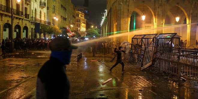 وقالت الوكالة الوطنية للإعلام إن المواجهات تصاعدت قبل ساعات بين متظاهرين حاولوا انتزاع وتخريب كل ما تطاله أيديهم وما بقي من بلاط على الأعمدة أو أغصان الأشجار لرمي عناصر مكافحة الشغب.