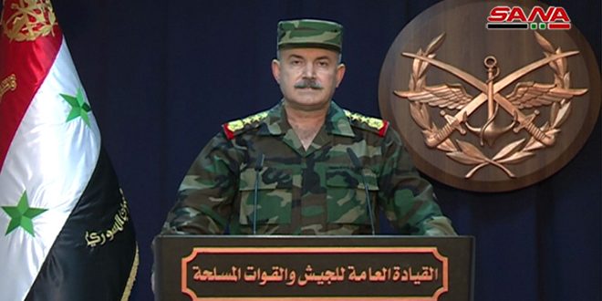 وذكرت القيادة العامة في بيان تلقت سانا نسخة منه أن وحدات من قواتنا المسلحة العاملة في ريف إدلب الجنوبي تابعت عملياتها العسكرية الهادفة إلى وضع حد لجرائم التنظيمات الإرهابية التي تستمر باستهداف المناطق الآمنة والمدنيين ونقاط تمركز الجيش بالقذائف الصاروخية والمفخخات.