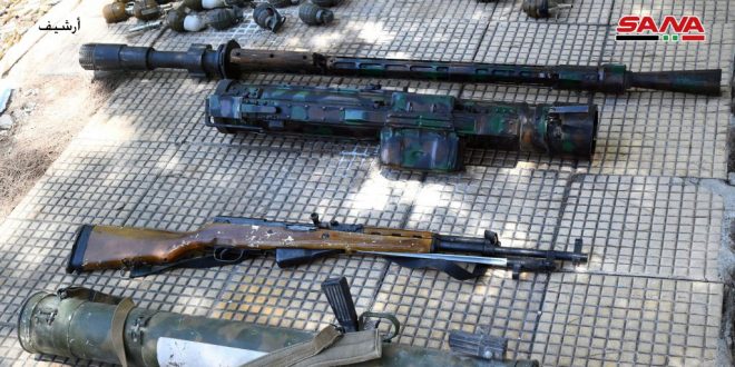 وعثرت الجهات المختصة منذ إعلان دمشق وريفها خالية من الإرهاب والإرهابيين في أيار من عام 2018 على كميات كبيرة من الأسلحة والذخائر من مخلفات الإرهابيين في عدة مناطق بريف دمشق بينها أمريكي وغربي وإسرائيلي الصنع.