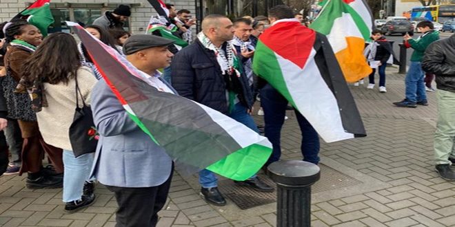 نظم أبناء الجالية الفلسطينية المقيمون في ايرلندا وقفة احتجاجية أمام السفارة الأمريكية في دبلن رفضاً لـ “صفقة القرن” التي تهدف إلى النيل من حقوق الشعب الفلسطيني بإقامة دولته المستقلة وعاصمتها القدس.