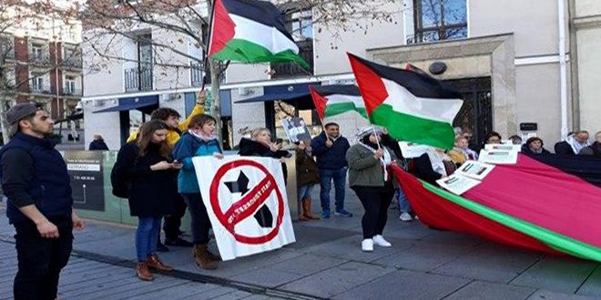 نظم أبناء الجالية العربية الفلسطينية أمس في مدريد وقفة احتجاجية أمام السفارة الأمريكية في العاصمة الإسبانية مدريد بالتنسيق مع عدة مؤسسات وممثلين عن أحزاب إسبانية وذلك رفضا لمؤامرة “صفقة القرن” الأمريكية الصهيونية ضد الشعب الفلسطيني.