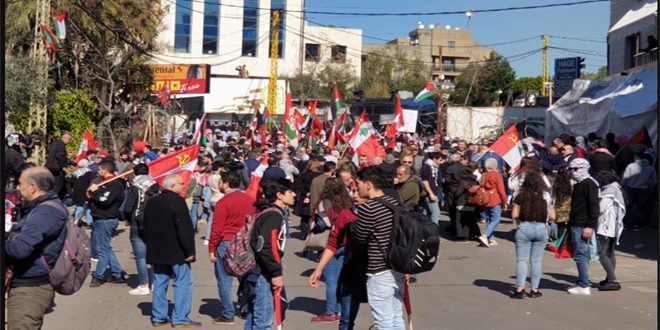 ورفع المتظاهرون الإعلام اللبنانية والفلسطينية وأطلقوا الهتافات المنددة بالإدارة الأمريكية مؤكدين أن القضية الفلسطينية هي قضية العرب المركزية وأن الصفقة ستسقط أمام ارادة الشعب الفلسطيني كما سقط من قبلها وعد بلفور وغيره من المؤامرات.
