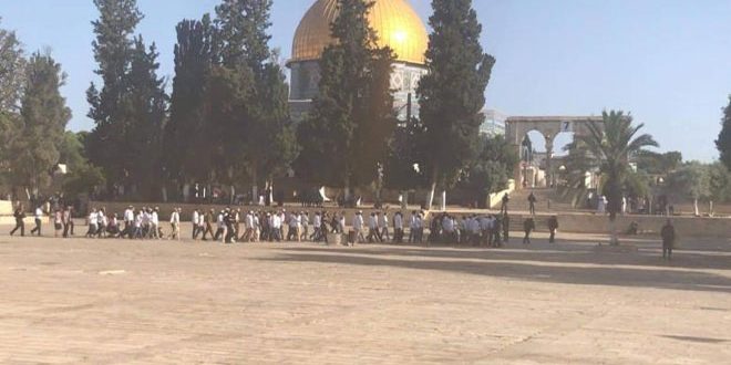 وذكرت وكالة وفا أن 140 مستوطنا اقتحموا الأقصى من جهة باب المغاربة ونفذوا جولات استفزازية في باحاته بحراسة مشددة من قوات الاحتلال.