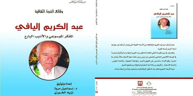 “عبد الكريم اليافي المفكر الموسوعي والأديب البارع” عنوان الكتاب الصادر عن الهيئة العامة السورية للكتاب والذي تضمن مقدمة للدكتور اسماعيل مروة عرض فيها سيرة ذاتية للباحث الموسوعي اليافي لافتا فيها إلى معرفة الباحث بأسرار جمال اللغة والأدب وتذوقه وأنه درس العلم إلى جانب الأدب وأنه عاد من باريس ليكون عالما فذا وأستاذا ومشرفا ومناقشا في الأدب والفلسفة والعلوم.