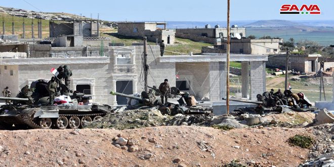 وكانت وحدات الجيش المتقدمة من ريف حلب الجنوبي التقت أمس بالقوات المتقدمة من ريف إدلب الجنوبي الشرقي في محيط تل العيس بعد دحر الإرهابيين الذين اتخذوا التل مقرا لهم ولممارسة جرائمهم بحق الأهالي.