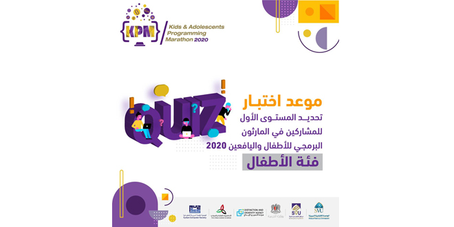 حددت الجامعة الافتراضية السورية وهيئة التميز والإبداع موعد اختبار تحديد المستوى الأول للمشاركين في الماراثون البرمجي للأطفال واليافعين لعام 2020 يوم السبت 15-2-2020 لفئة الأطفال والسبت 7-3-2020 لفئة اليافعين ضمن المراكز التابعة للجامعة والجمعية العلمية السورية للمعلوماتية في المحافظات.