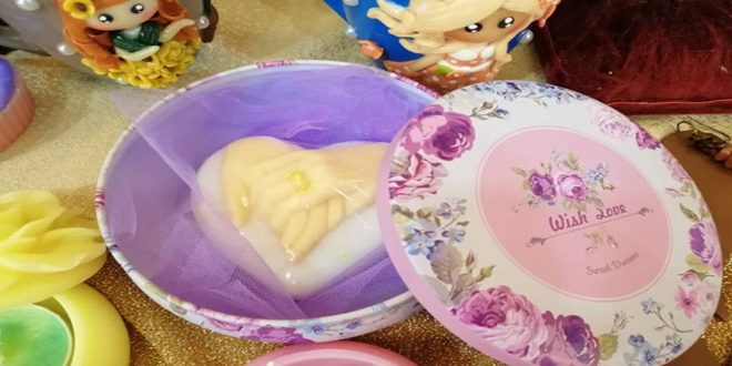بدورها الشابة عطاء السباعي حاصلة على دبلوم في الأدب الانكليزي أوضحت أنها طالما أحبت العمل بالشمع وتعطيره وتلوينه وتشكيله قبل أن تنتقل إلى الصابون الخام القابل للذوبان أيضا لتشتغل عليه بالطريقة نفسها مبينة أن موهبتها هذه تلاقت مع موهبة صديقتها خشفة المتخصصة بالسيراميك ليجمعهما مشروع “صنع بحب”.
