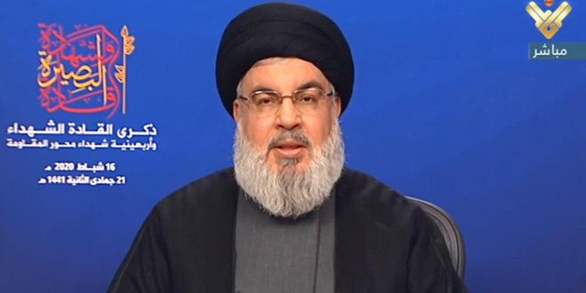 وشدد السيد نصر الله على أن جريمة اغتيال الفريق قاسم سليماني وأبو مهدي المهندس ومن ثم إعلان ما تسمى “صفقة القرن” وكل جرائم الرئيس الأمريكي دونالد ترامب أدخلت المنطقة ومحور المقاومة في مرحلة جديدة وحساسة ومصيرية جدا تفرض الذهاب إلى مواجهة الإدارة الأمريكية.