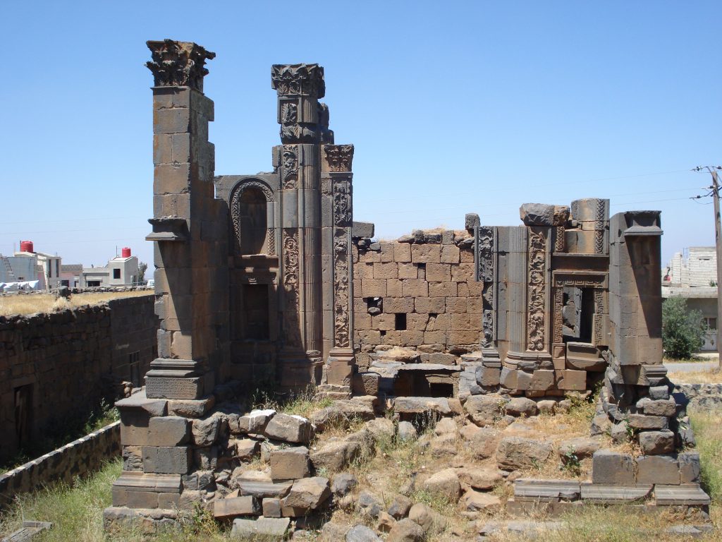 أما المعبد الشمالي فواجهته الجنوبية حسب كيوان على حالها الأولى مع أعمدة مزركشة بنقوش ذات خطوط تؤلف عضادتي بابها مشيراً إلى أن المعبد بني أيضاً منتصف القرن الثاني الميلادي أي زمن حكم الامبراطور كاراكالا تكريماً للإله النبطي تياندريوس على نمط المعبد الجنوبي واستخدم مسكناً لفترة طويلة وتحول في وقت ما إلى كنيسة وبقيت بضع كلمات من وثيقته التأسيسية على الطرف الأيمن لرواق المدخل تفيد بأنه كان معبداً لرب الطقس ولم يبق سوى أجزاء من رواق مدخله والمصلى مع القوس الذي يقوم فوق مصطبة أو طابق أرضي.