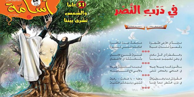 أما كلمة العدد فكانت بعنوان “51 عاماً وأسامة معكم” كتبها رئيس تحرير المجلة قحطان بيرقدار ورسمها رامز حاج حسين ومن قصائد العدد قصيدة “حبات المطر” للشاعر محمود حامد رسمتها دعاء الزهيري.