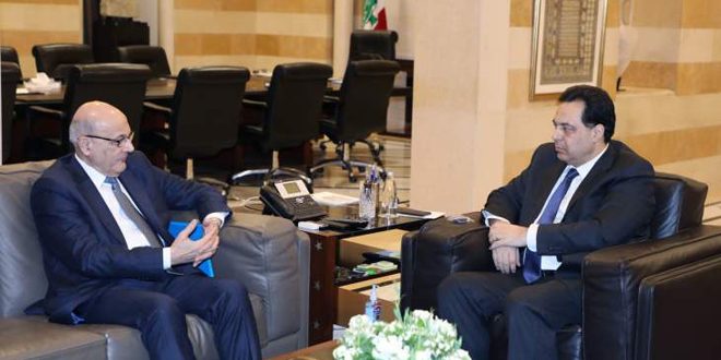 بحث رئيس مجلس الوزراء اللبناني حسان دياب مع الأمين العام للمجلس الأعلى السوري اللبناني نصري خوري خلال لقائهما اليوم سبل تعزيز العلاقات الثنائية بين لبنان وسورية.