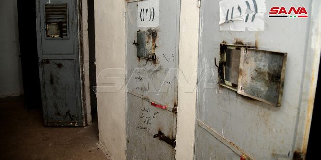 المبنى الذي يضم 3 كتل ضخمة كانت في السابق وقبل دخول الإرهابيين إليها تستخدم قاعات لمحاضرات طلاب المعهد ومخابر وأماكن ترفيه توزعت على جدرانه كتابات تحض على القتل وشعارات لتنظيمي “داعش” و”جبهة النصرة” الإرهابيين خلال سيطرتهما على المنطقة إضافة إلى وثائق انتساب وأخرى تبين اتباع دورات لعناصر من التنظيمين من جنسيات غير سورية.