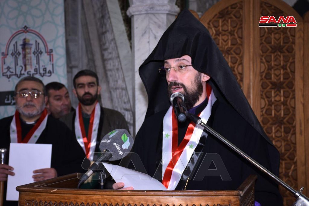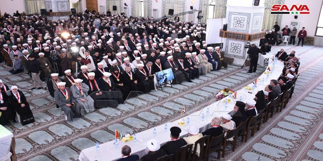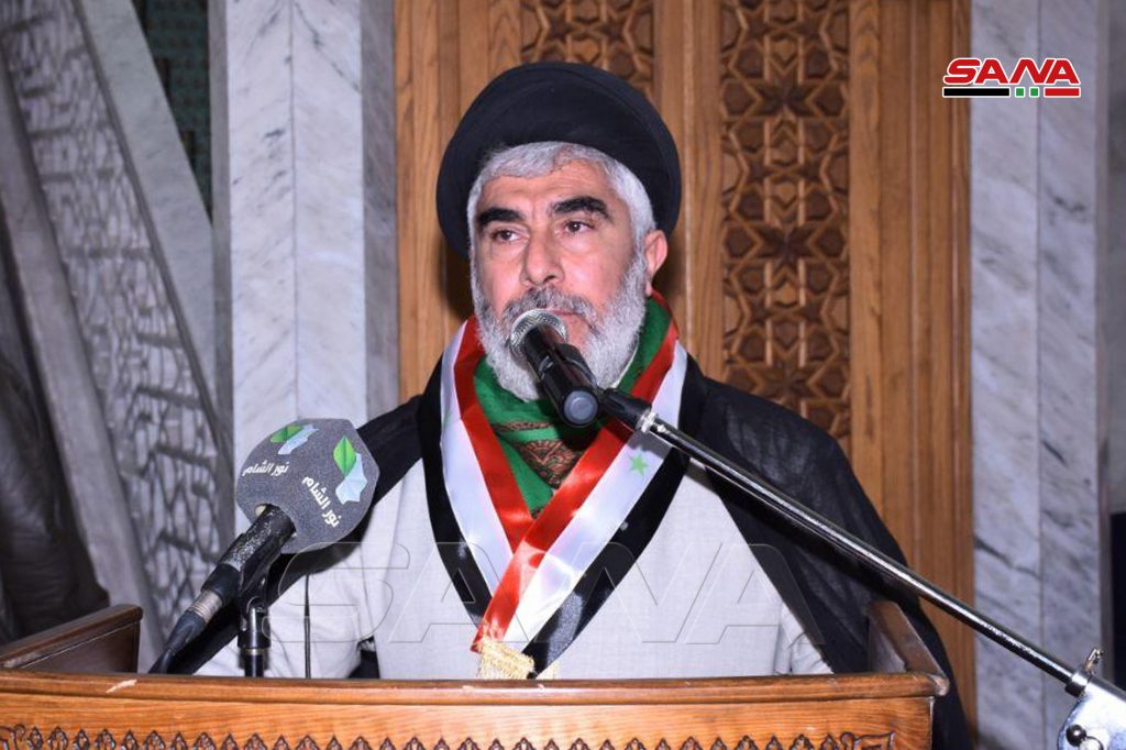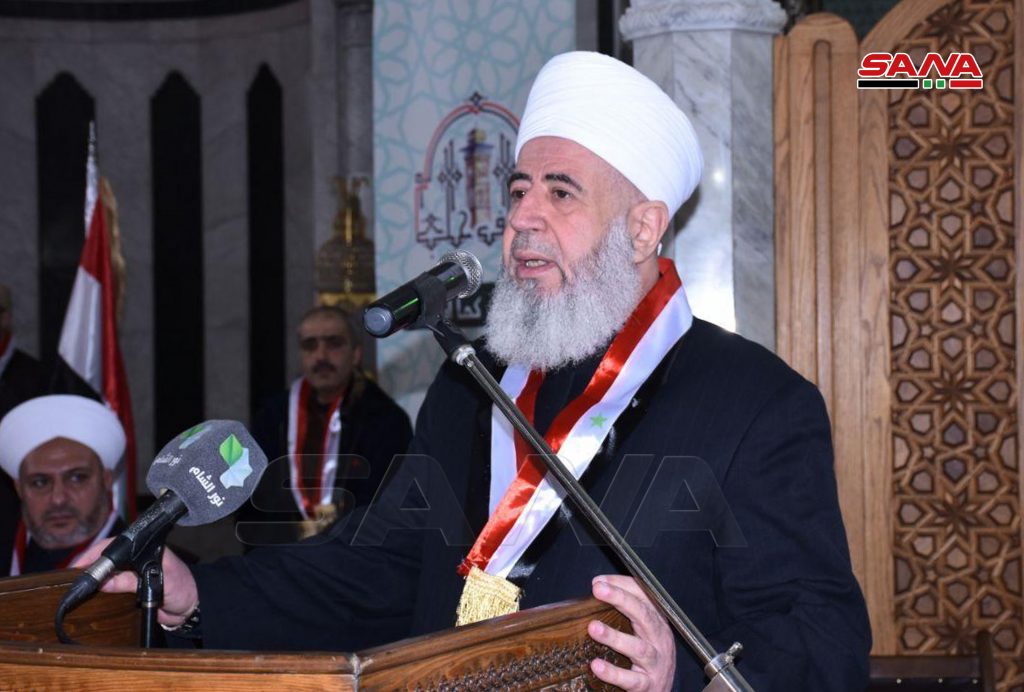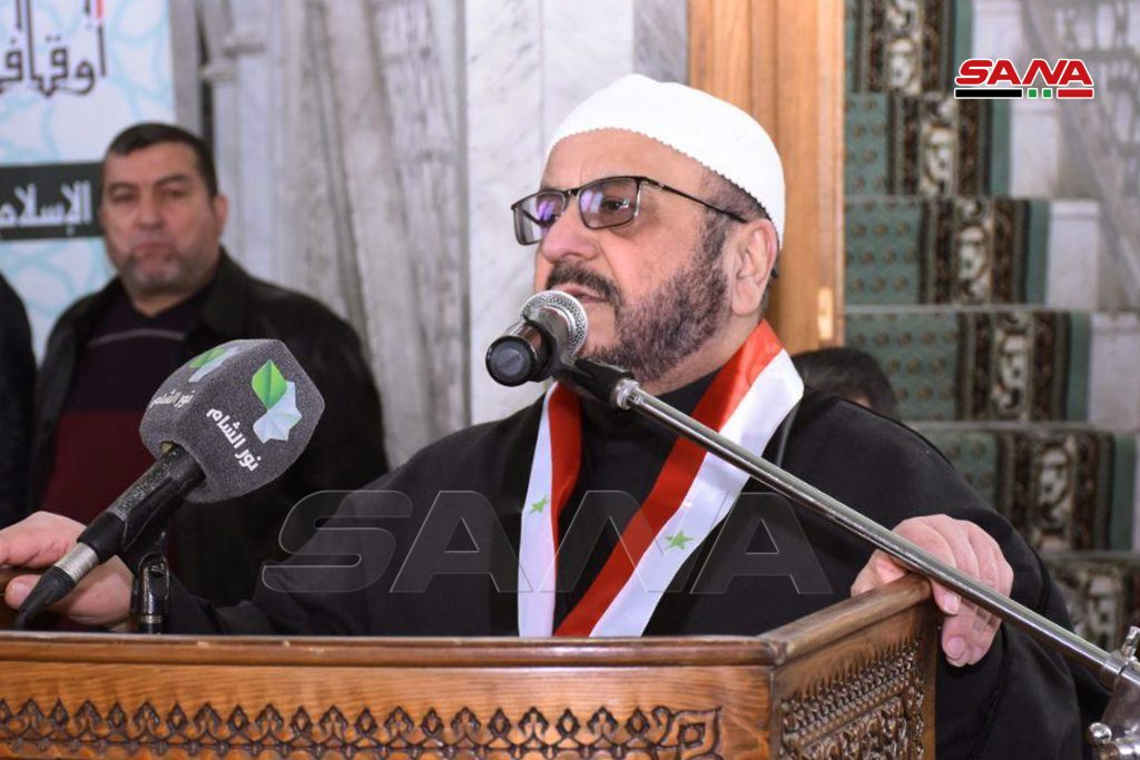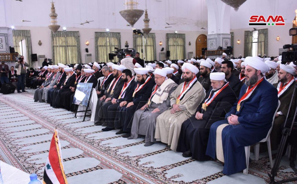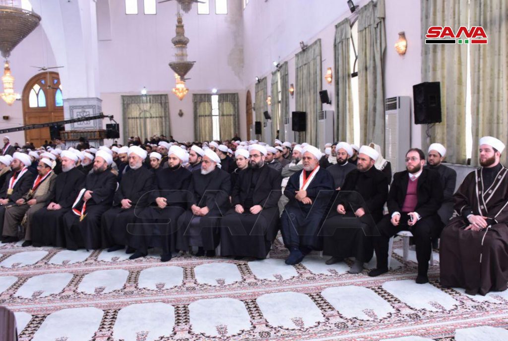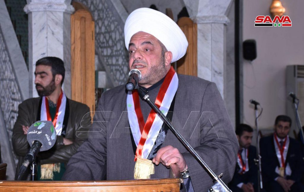 وأكد وزير الأوقاف أن الإسلام جاء بالرحمة والمحبة والحضارة ولا تمثله ولا تعبر عنه جماعات التكفير الإخونجية والوهابية منوهاً بالتضحيات التي يبذلها الجيش العربي السوري لتحرير كامل الجغرافيا السورية من الإرهاب التكفيري.