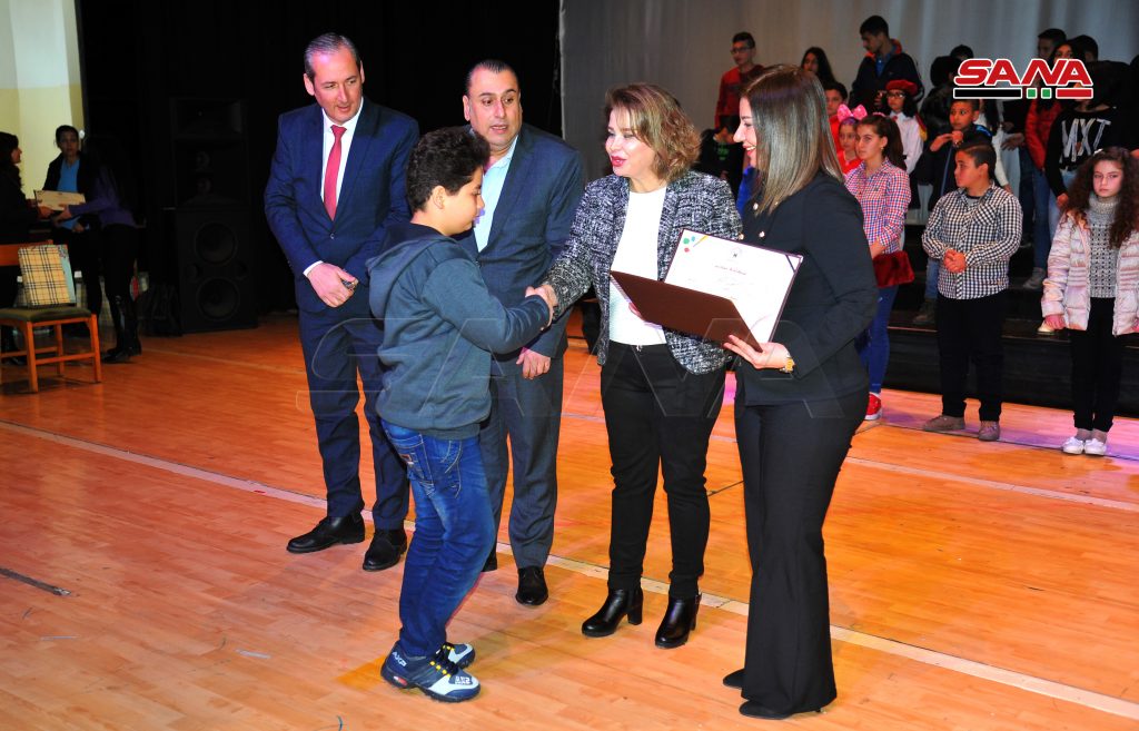 وشمل التكريم الذي جاء ضمن احتفالية استضافتها دار الأسد للثقافة باللاذقية تحت عنوان “طفولة وإبداع” حوالي مئة طفل وطفلة فائزين في المجالات الفنية “رسم وخط وتصوير ضوئي وشعر وقصة ومقالة” مقسمين على فئات عمرية من السابعة وحتى السبعة عشر عاما.
