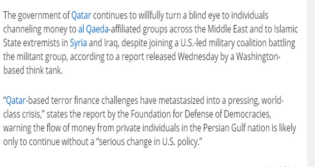 فقد كشفت مؤسسة الدفاع عن الديمقراطيات البحثية الأميركية أن سلطات آل ثاني القطرية لا تزال تتعامى عمدا وتغض الطرف عن تدفق الأموال إلى التنظيمات الإرهابية في الشرق الأوسط وخصوصا تنظيم داعش الإرهابي في سورية والعراق بالرغم من انضمامها المعلن إلى تحالف واشنطن ضد التنظيم وهي تدير في الوقت نفسه استثمارات واسعة بأموال طائلة في دولة غربية رئيسية مشاركة في التحالف.