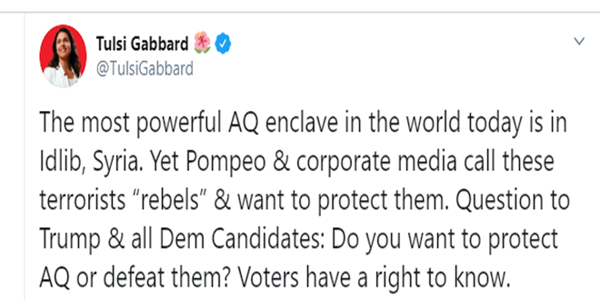 غابارد أكدت في تغريدة نشرتها على موقع تويتر للتواصل الاجتماعي أن إدلب تعتبر “أكبر معقل لتنظيم القاعدة الإرهابي” مشيرة إلى أنه على الرغم من إدراك الساسة في الولايات المتحدة والعالم هذه الحقيقة إلا أن “وسائل الإعلام الأمريكية ما زالت تصف إرهابيي التنظيم المذكور بـ “المتمردين” وتريد حمايتهم”.