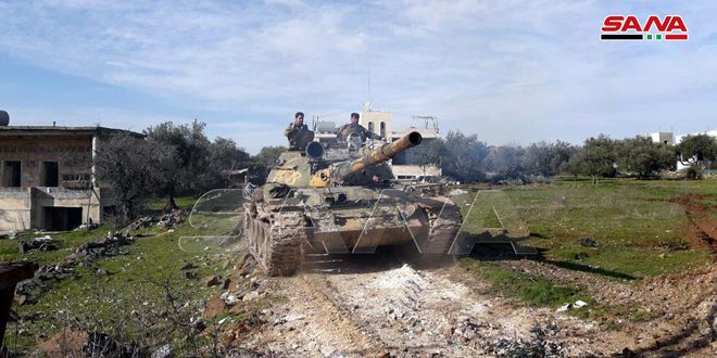 ودحرت وحدات الجيش أمس التنظيمات الإرهابية من قرى وبلدات جوباس وترنبة وداديخ وكفر بطيخ غرب الطريق الدولي حلب-دمشق وقرية حزارين والتي كان قد دخلها الإرهابيون بدعم مباشر وتغطية نارية من قوات النظام التركي.