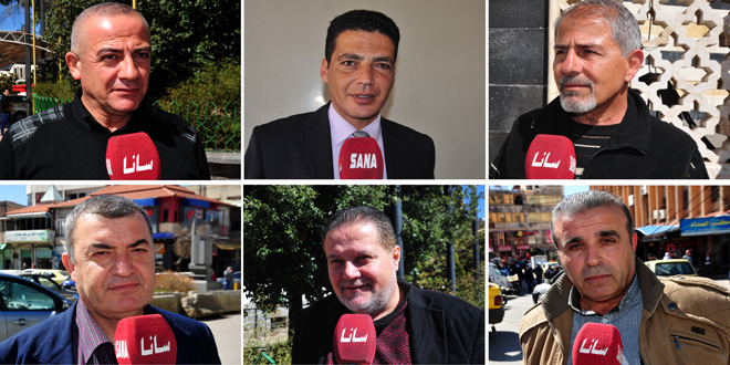 وفي لقاءات مع مراسل سانا أكد أهالي الجولان المحتل أن داعمي الإرهاب يحاولون التلطي خلف شعارات وعناوين زائفة للوصول إلى أطماعهم مشددين على وحدة الموقف مع جيشنا الباسل الذي سيكتب النصر بفضل بطولات ودماء الشهداء الذين يدافعون عن وحدة التراب السوري على امتداد الجغرافية السورية.