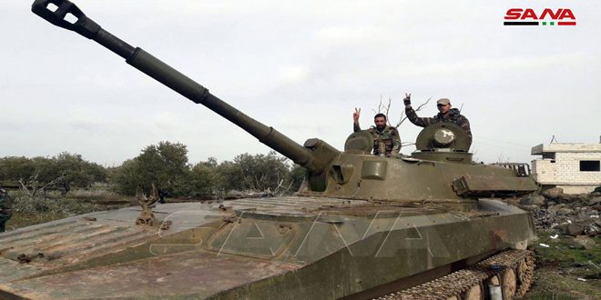 ودحرت وحدات الجيش أمس الأول التنظيمات الإرهابية من قرى وبلدات جوباس وترنبة وداديخ وكفر بطيخ غرب الطريق الدولي حلب-دمشق وقرية حزارين والتي دخلها الإرهابيون بدعم مباشر وتغطية نارية من قوات النظام التركي.