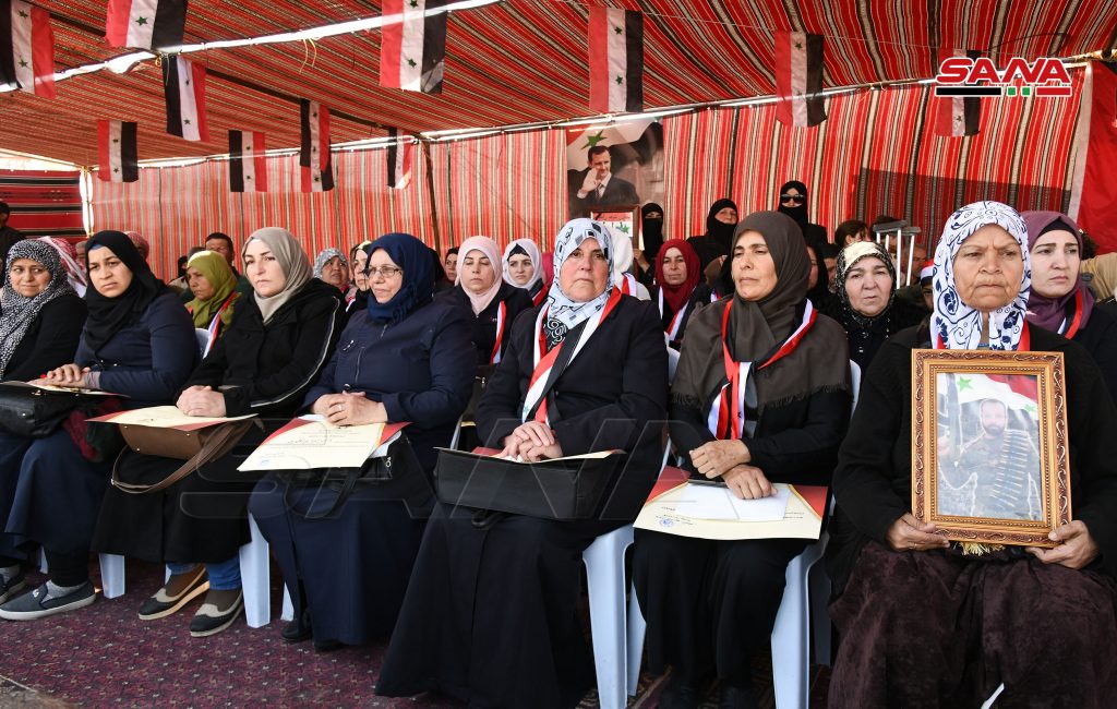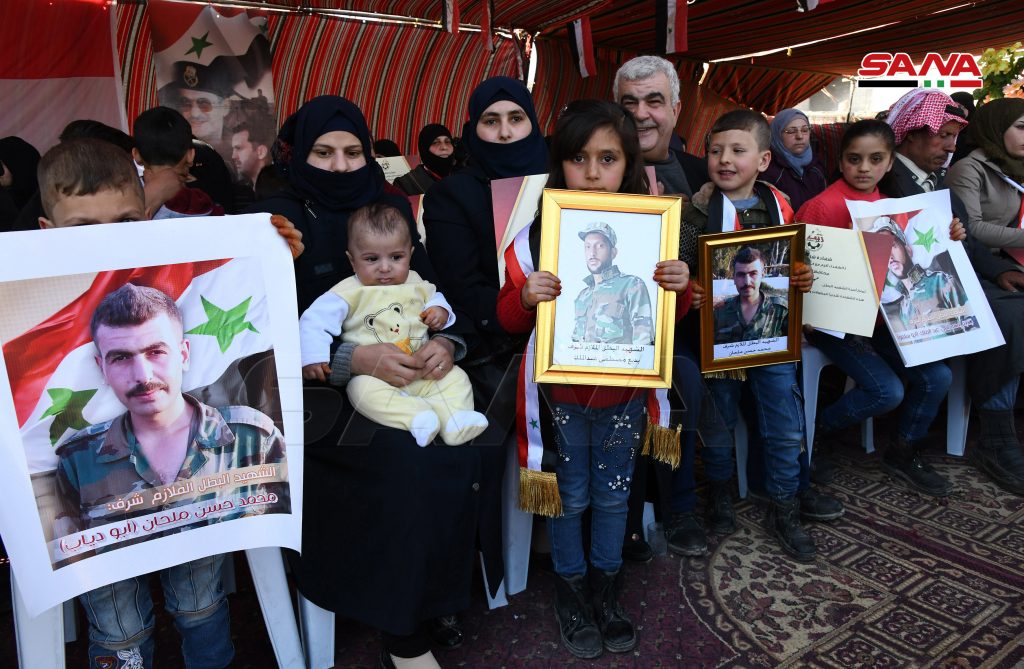 وأعرب عدد من أهالي الشهداء المكرمين عن فخرهم واعتزازهم ببطولات أبنائهم الذين استشهدوا دفاعا عن الوطن مؤكدين استمرارهم بالوقوف إلى جانب جيشهم وقيادتهم لتحرير كامل التراب السوري حيث أشار عدنان الدعاس والد الشهيد علاء الدين الذي استشهد في حلب إلى أن التكريم شرف كبير له وهو مستعد لتقديم جميع أبنائه فداء للوطن بينما لفتت زوجة الشهيد العقيد مازن مالك محمد الذي استشهد بالقريتين إلى أنها تسعى جاهدة لتربية أبنائها على حب الوطن وإكمال مسيرة والدهم.