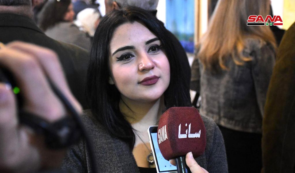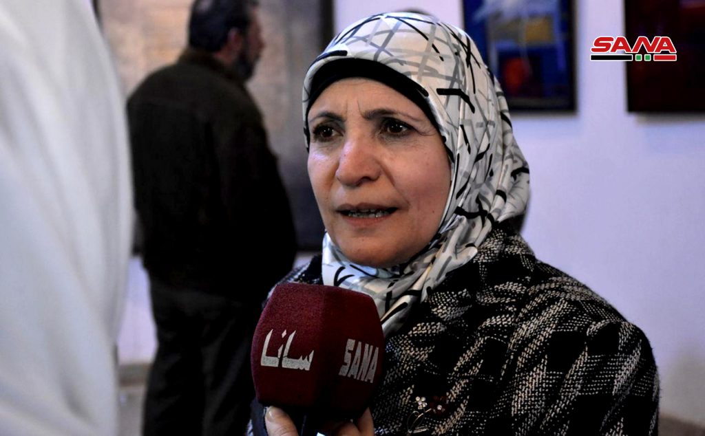 بدورها أشارت الفنانة بتول الحموي إلى مساهمتها ببورتريه لامرأة تبكي مجسدة حالة نفسية تعيشها الأنثى بين الحزن والفرح بخبر الانتصار مع وجود الحمام باللون الأبيض في اللوحة تعبيرا عن السلام والنقاء.
