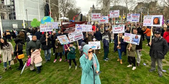 وعقب مسيرة بدأت على امتداد شارع وايت هول الذي يربط ميدان ترافلغار التاريخي بميدان البرلمان تجمعت الحشود أمام مجلس العموم ورفعوا لافتات تدعو للإفراج الفوري عن النساء اللاتي يقبعن داخل السجون في تركيا بسبب آرائهن مثل بشرى أردال وعائشة نور باريلداك وفيجان يوكسكداغ.