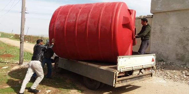 استكمالا لمشروع دعم سبل العيش وزعت مديرية الزراعة في درعا 201 خزان للمياه بسعة 8 أمتار مكعبة للخزان الواحد على الأسر المستهدفة في بلدات نامر وخربة غزالة والكرك وجاسم ونوى بريف المحافظة مقدمة من منظمة الأغذية والزراعة التابعة للأمم المتحدة (الفاو).
