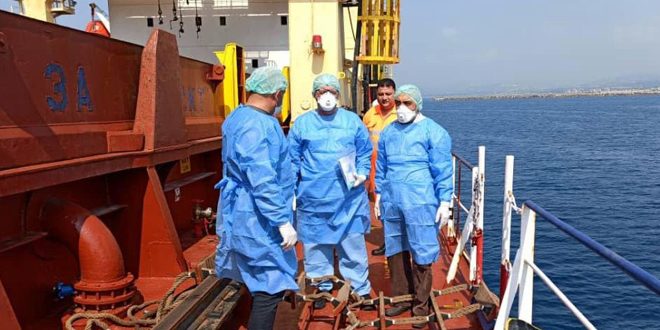 في إطار تطبيق الإجراءات الاحترازية للتصدي لفيروس كورونا بدأت فرق عمل وزارة النقل بالتعاون مع الكوادر الطبية في وزارة الصحة بتعقيم السفن القادمة إلى سورية والمتوضعة في الموانئ البحرية.