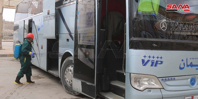 وذكر رئيس الدائرة الصحية بمجلس المدينة المهندس مهند المصطفى في تصريح لمراسل سانا أن الفرق المختصة بمجلس المدينة باشرت تعقيم حافلات النقل الجماعي في كراج البولمان وكافة مرافق الكراج لافتاً إلى أن حركة السفر تسير بصورة طبيعية وهذا الإجراء الاحترازي سيتم تطبيقه بصورة يومية حفاظاً على سلامة المواطنين.