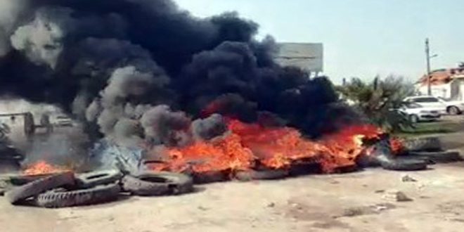 وأظهرت مقاطع فيديو نشرت على صفحات التواصل الاجتماعي مجموعات إرهابية مسلحة تشعل الإطارات وتحتمي وراء عشرات المدنيين لمنع مرور أي آلية على الطريق.