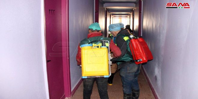كاميرا سانا رصدت حملة التعقيم في المدينة الجامعية حيث أوضح المهندس فادي حجل رئيس فرع مؤسسة الإسكان العسكري 316 أنه تم تشكيل فرق لرش مواد التعقيم في 20 وحدة سكنية إضافة إلى الساحات والممرات الخارجية.