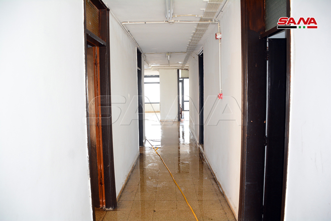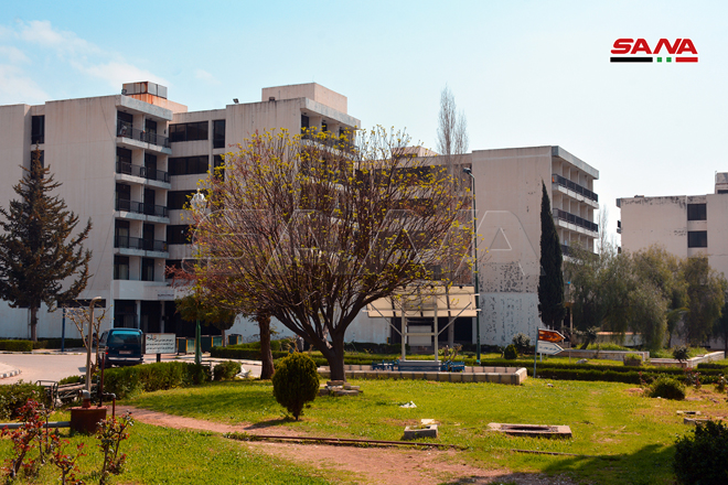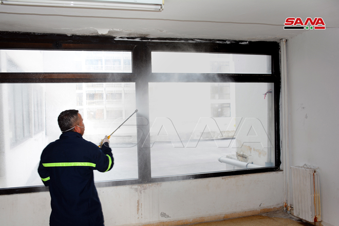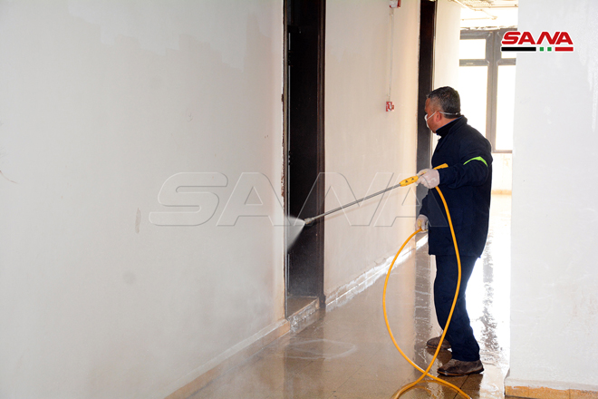 ضمن الإجراءات المتبعة للتصدي لفيروس كورونا المستجد تقوم إدارة المدينة الجامعية في جامعة تشرين بأعمال التعقيم الداخلي والخارجي للوحدات السكنية.