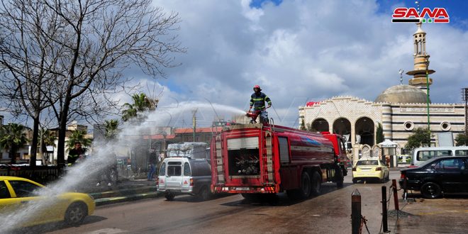 قائد فوج إطفاء السويداء نايف الشعار أشار بدوره إلى أن آليات الفوج واصلت عمليات تعقيم الأسواق والشوارع والمرافق العامة من خلال صهاريجها المزودة بالمعقمات المناسبة وذلك ضمن خطة تشمل كل أرجاء المدينة.