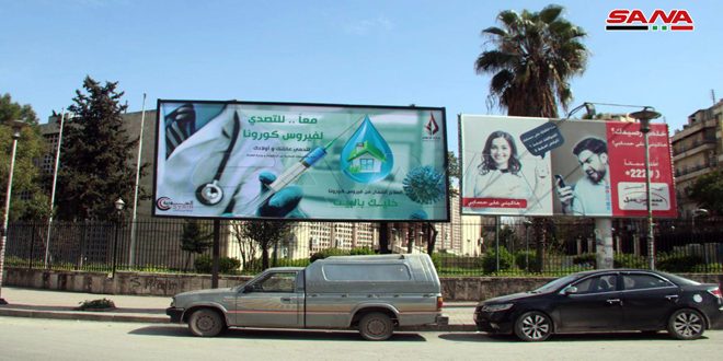 وفي طرطوس نشر فرع المؤسسة العربية للإعلان بالمحافظة مجموعة من النصائح والإرشادات حول طرق الوقاية وأهم العادات الصحية الواجب اتباعها للتصدي لفيروس كورونا على نحو 50 لوحة إعلانية توزعت في مناطق التجمعات السكانية الكبيرة ومنها الكورنيش البحري ودوار الساعة وشارع الثورة ودوار المحافظة ومنطقة الكراجات القديمة والجديدة.