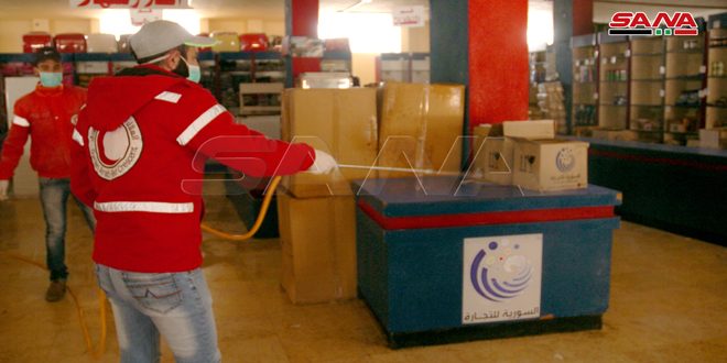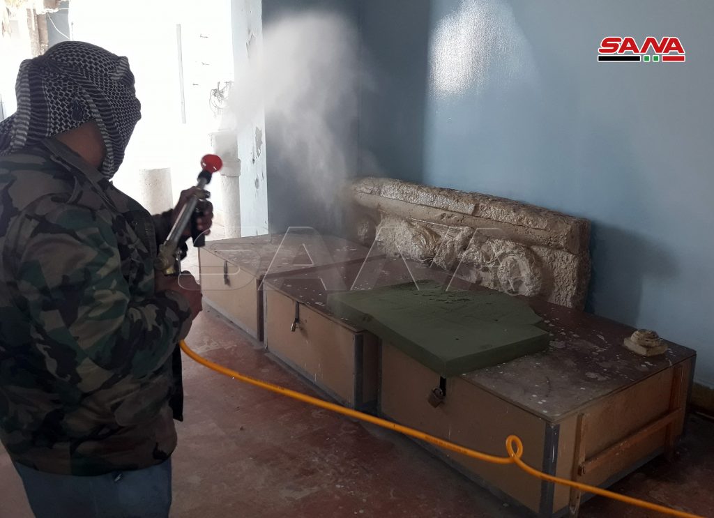 وفي حمص نفذت ورشات مجلس مدينة تدمر بالتعاون مع مصلحة الزراعة ومنطقة تدمر حملة تعقيم شملت شوارع وساحات المدينة ومتحف تدمر الوطني والمدارس وصالة السورية للتجارة ومكتب وكالة سانا والمركز الإذاعي والتلفزيوني ومقر مجلس المدينة والمطاعم ومحلات الأغذية وفق رئيس مجلس المدينة المهندس هاني دعاس.
