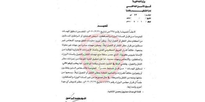 ودعت الوزارة في تعميم تلقت سانا نسخة منه إلى تدقيق المهمات الممنوحة “من قبل ضابط حصراً” للأشخاص الذين يتنقلون أو يتجولون خلافاً للقرارات والتعاميم المتعلقة بحظر التنقل أو التجوال ليلاً وسحبها من حاملها ومنعه من التنقل والحركة في حال صدورها من غير الوزراء والمحافظين.