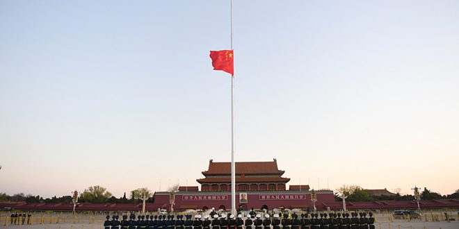 نكست الصين اليوم العلم الوطني في ميدان تيان آن من بالعاصمة بكين حدادا على الذين قضوا في المعركة ضد وباء فيروس كورونا المستجد وأرواح ضحايا المرض.