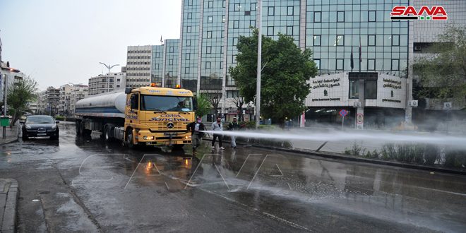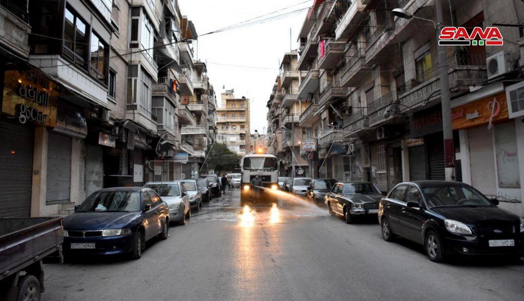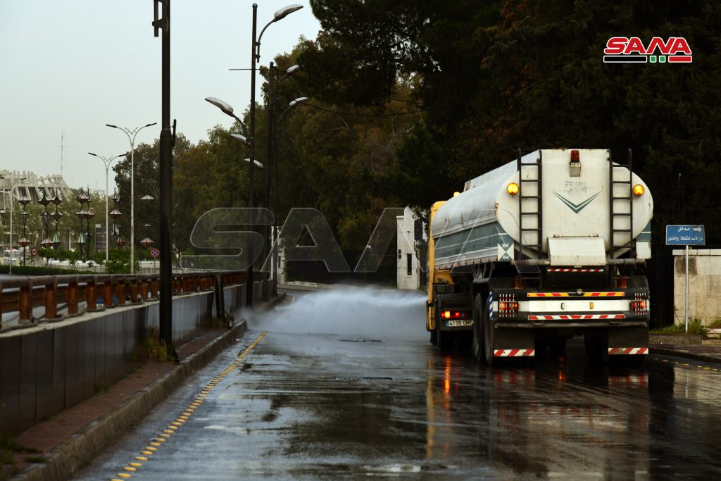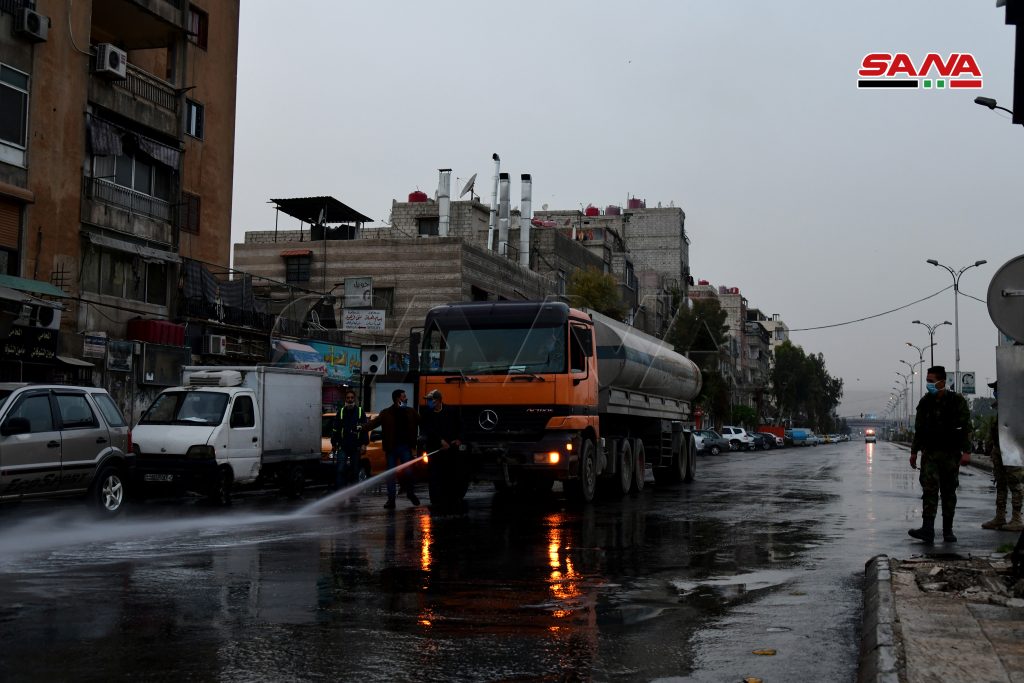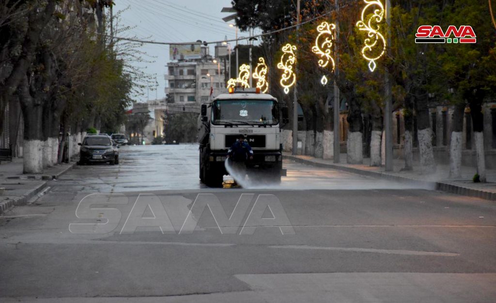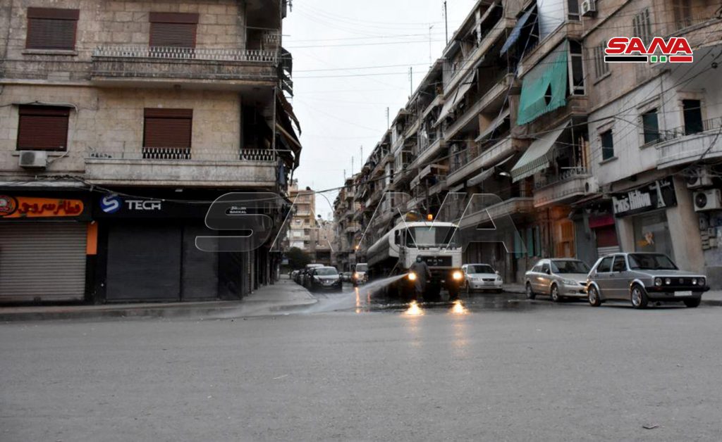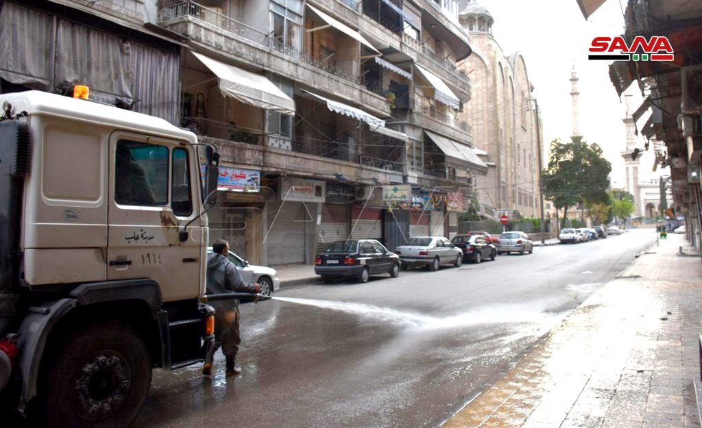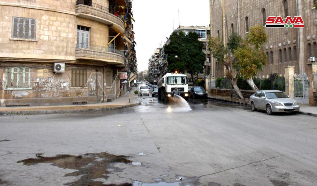 تتواصل حملات التنظيف والتعقيم في أحياء وشوارع مدينتي دمشق وحلب إضافة إلى غسل حاويات القمامة وذلك ضمن الإجراءات الاحترازية للتصدي لفيروس كورونا المستجد.