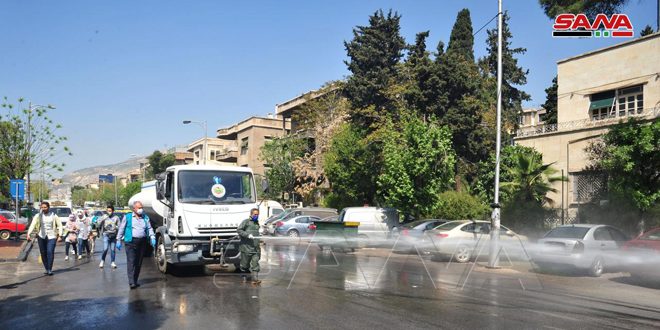 تستمر محافظة دمشق في حملات التنظيف والتعقيم لأحياء وشوارع المدينة بشكل يومي ضمن الجهود المبذولة للتصدي لفيروس كورونا.