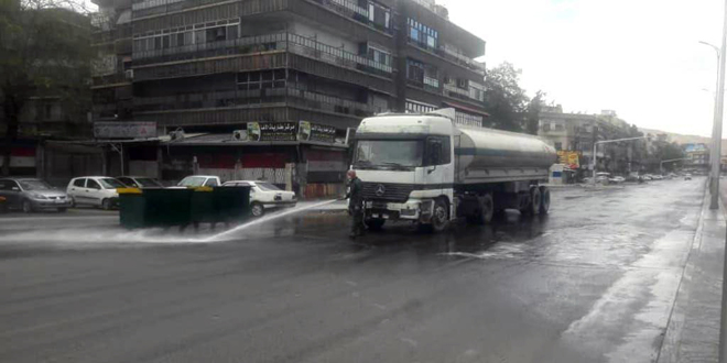 ففي دمشق قامت ورشات مديرية النظافة بتنفيذ اعمال الشطف والتعقيم لمنطقة البزورية وساحة باب توما وصولاً إلى باب شرقي بالمدينة القديمة وعدد من الشوارع والحارات في أبو رمانة والشعلان والروضة ومن محيط مشفى التوليد ونزلة المتحف ومدرج الجامعة وصولاً إلى وزارة السياحة وطلعة البريد وشارعي النصر والبختيار إضافة إلى منطقة الصراف بالميدان وذلك وفق مدير النظافة المهندس عماد العلي.