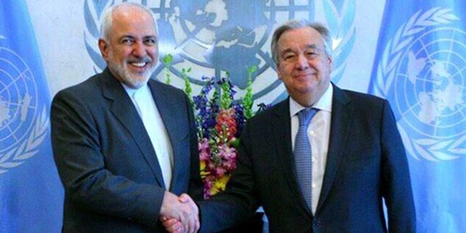بحث وزير الخارجية الإيراني محمد جواد ظريف خلال اتصال هاتفي اليوم مع الأمين العام للأمم المتحدة أنطونيو غوتيريس الحظر الأمريكي الأحادي وغير القانوني ضد إيران.