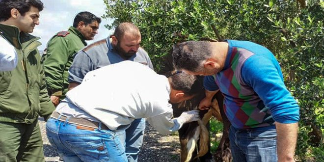 وأكد خير بك أن قطيع الأبقار في القرية ملقح بالمجمل خلال شهر آذار بلقاح الحمى القلاعية ولقاح جدري الأغنام والماعز “العترة الكينية” وفق الخطة الوزارية موضحاً أن مديرية الزراعة أطلقت اليوم حملة لمكافحة الحشرات الماصة التي تعتبر العامل الرئيس في نقل المرض بمشاركة عشر آليات مزودة بالمرشات الرذاذية والضبابية وستتم تغطية المنطقة بالكامل.