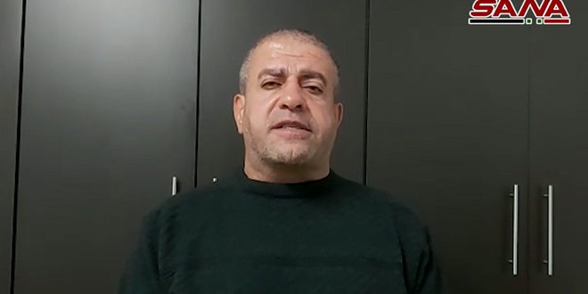 وتابع الأسير المحرر المقت: “وهنا اخاطب جميع شعوب العالم بأن تقف ضد الغرب الاستعماري وسياساته العدوانية ضد شعوب العالم وفي مقدمة هذه السياسات “الحصار الأمريكي ضد سورية” باعتباره شكلا من أشكال العدوان وأخاطب كل شعوب العالم بألا يصدقوا أكذوبة أمريكا بأنها تدافع عن الإنسانية وعن السلام العالمي وألا يصدقوا أكاذيبها بأنها ضد الإرهاب وأنها تحارب الكورونا”.