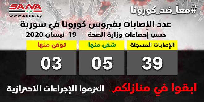 وأوضحت الوزارة في بيان تلقت سانا نسخة منه أنه تم تسجيل إصابة جديدة بفيروس كورونا المستجد كما تم تسجيل حالة وفاة من الإصابات المسجلة سابقاً ليصبح إجمالي الإصابات المسجلة في سورية حتى الآن 39 إصابة شفي منها 5 إصابات وتوفيت 3 حالات.