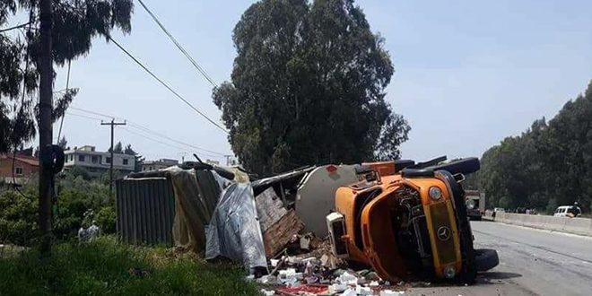 أصيب شخصان جراء تدهور صهريج محمل بالبنزين على الطريق الدولي حمص طرطوس بالقرب من مفرق الصفصافة بريف طرطوس.