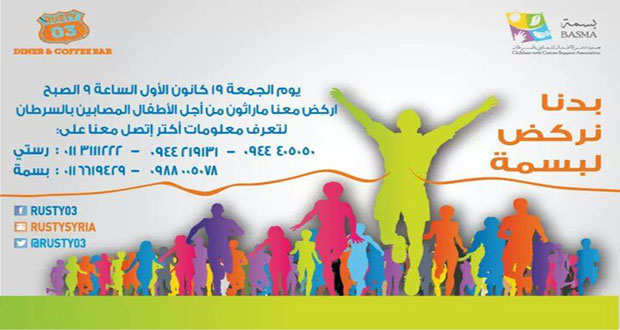 يقام يوم الجمعة القادم ماراثون خيري يرفع شعار بدنا نركض لبسمة لدعم أطفال السرطان وتحسين واقع الخدمات الطبية المقدمة لهم حيث ينطلق الماراثون الذي ينظمه مطعم رستي بالتعاون مع جمعية بسمة لدعم الأطفال المصابين بالسرطان عند تمام الساعة التاسعة صباحا من الجزيرة السابعة في مشروع دمر وسط دعوات متنوعة لفعاليات أهلية واجتماعية وطبية.