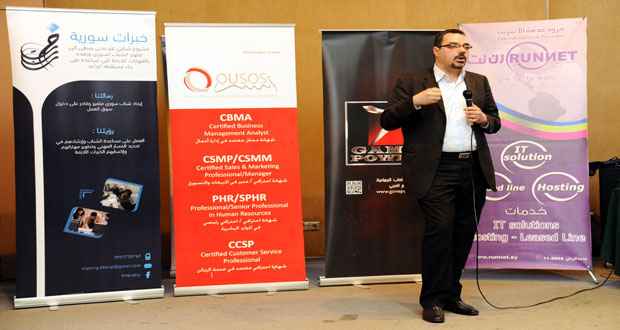 بدوره أوضح ياسر الصقال مسؤول المبيعات في شركة /أسوس/ لتدريب وتطوير الموارد البشرية التي تقدم مجموعة من الحقائب التدريبية بمجالات الإدارة والموارد البشرية والتدريب على إدارة المبيعات والتسويق أنه تم التعاون مع فريق خبرات سورية خطوة بخطوة ومشاركتهم في هذه الفعالية بهدف تفعيل مبادرة كل شاب سوري يحتاج إلى من يصغي إليه وإلى مكان يحتوي مبادرته.
