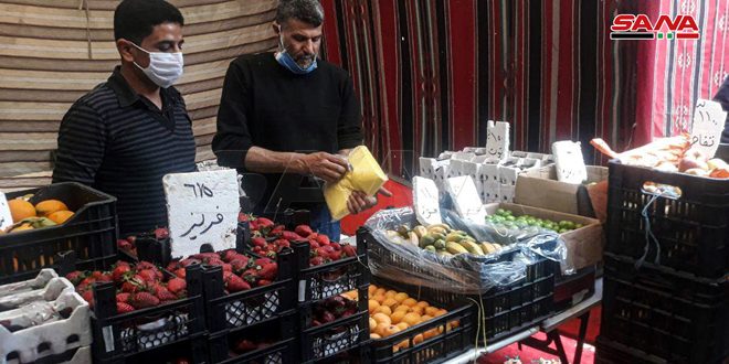 وخلال رصد مراسلة سانا لأسعار عدد من الخضراوات والفواكه في السوق الشعبي بجرمانا جانب المدينة الرياضية بحي البلدية كان سعر الكيلو الواحد من الفليفلة 310 ليرات والباذنجان 380 ليرة والخيار البلدي 430 ليرة والبندورة 500 ليرة والفاصولياء 660 ليرة والليمون 960 ليرة والثوم 1000 ليرة والزهرة 240 ليرة والبصل 195 ليرة والبازيلاء 410 ليرات والفول 190 ليرة والبطاطا 390 ليرة أما الفواكه فبلغ سعر الكيلو الواحد من الموز 1100 ليرة والبرتقال 600 ليرة والفريز 675 ليرة والتفاح 1100 والأكدنيا 1500 والتوت الشامي 150 ليرة الصندوق الصغير.